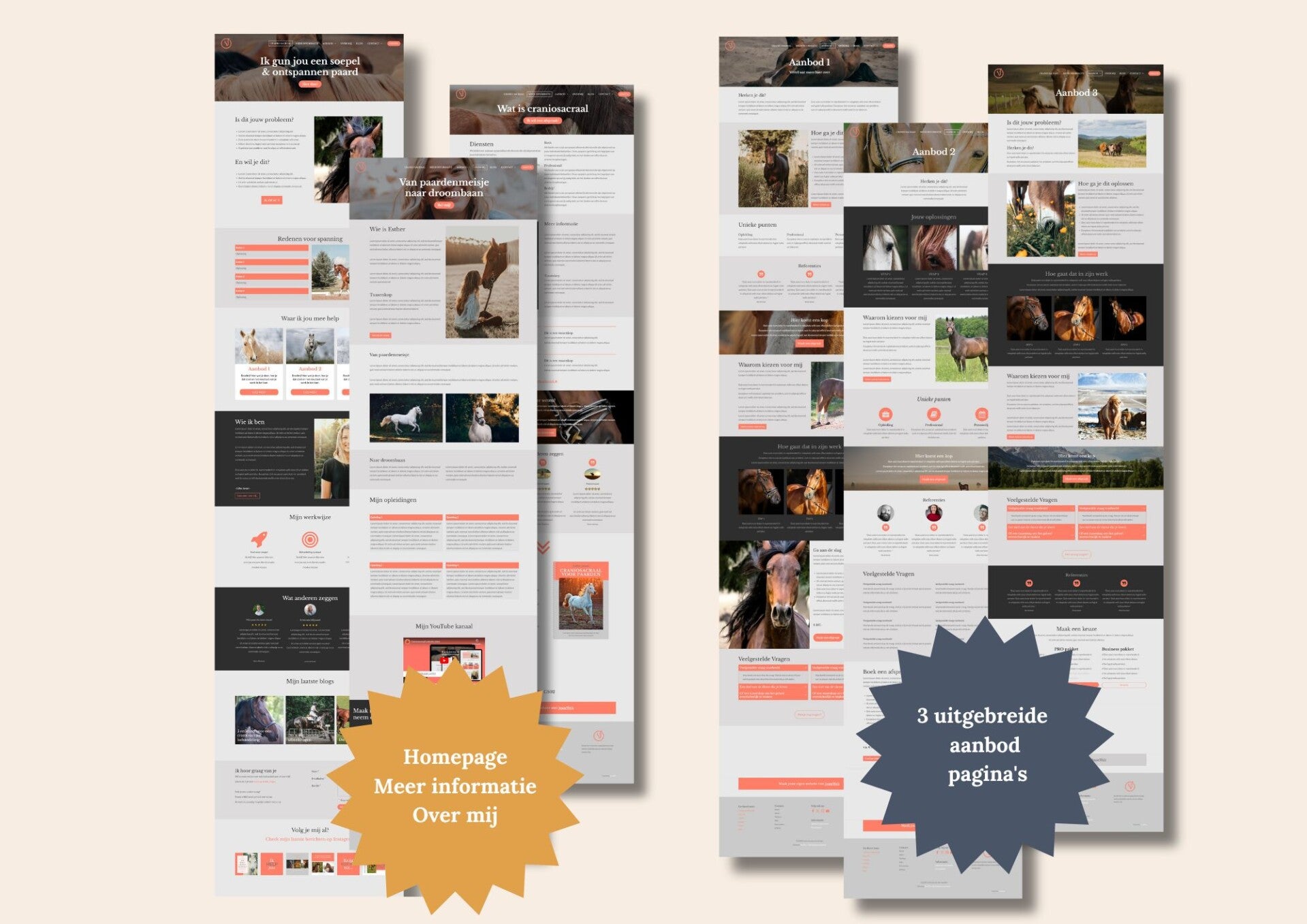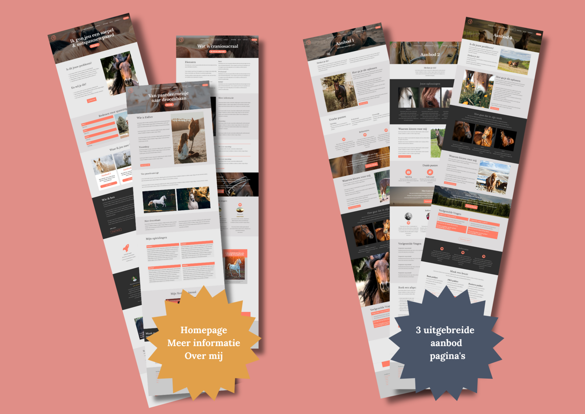 Ik heb templates gemaakt die speciaal voor paardenprofessionals zijn ingericht met JouwWeb, zodat jij dat eenvoudig zelf kunt vullen met jouw teksten en foto’s. Maar ook je eigen huisstijl kleuren, lettertypes, logo etc. kunt gebruiken.