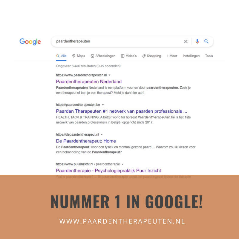 Paardentherapeuten Nederland is nog maar een paar weken op stoom en staat nu al, van de bijna 8500 resultaten op 'paardentherapeuten', op NUMMER 1 in Google!!! Zooooo trots. We werken er hard voor dus zo'n opsteker is dan geweldig om te zien.